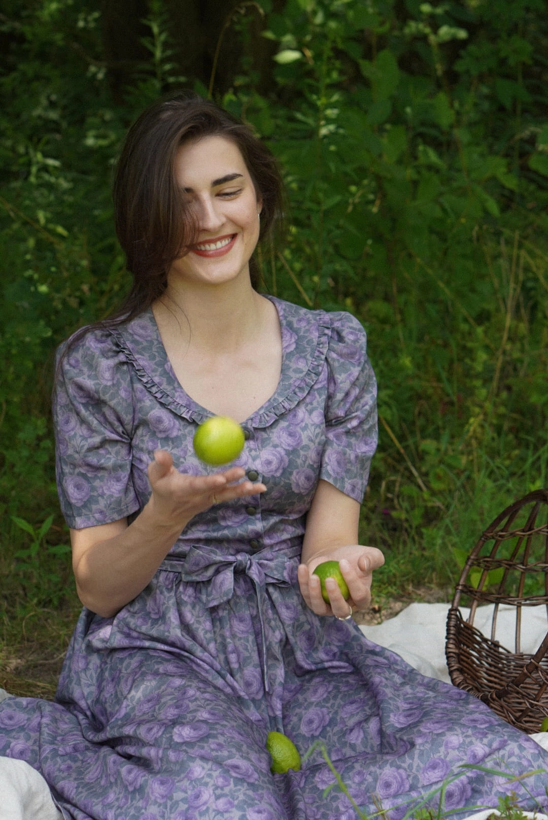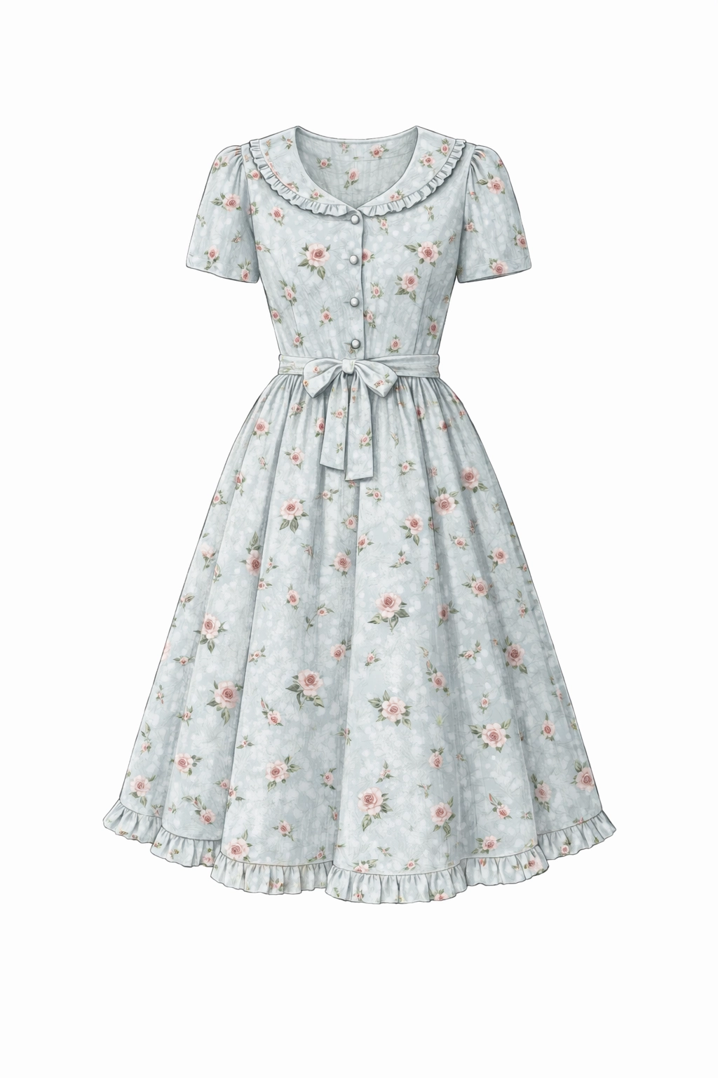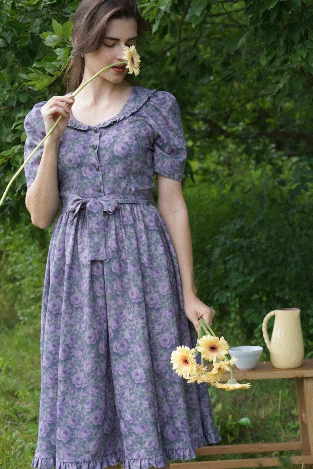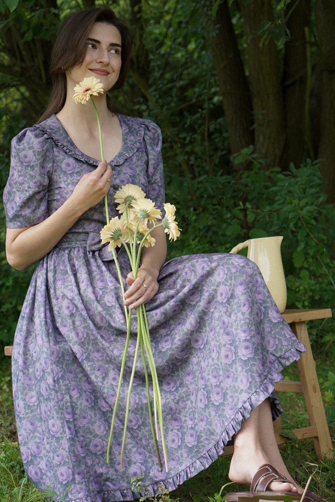 Uroczy kołnierzyk wykończony falbanką. Rękawy z bufkami. Marszczona spódnica w kształcie litry „A” z doszytą falbaną. Zapinana z na zamek z tyłu oraz guziczki z przodu. Jak każda nasza sukienka posiada boczne, niewidoczne kieszenie oraz pasek w komplecie.