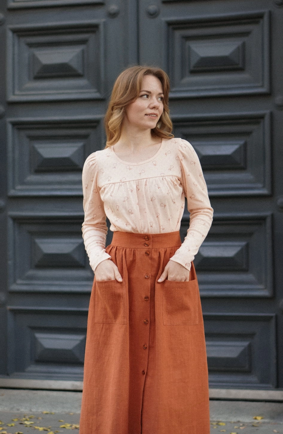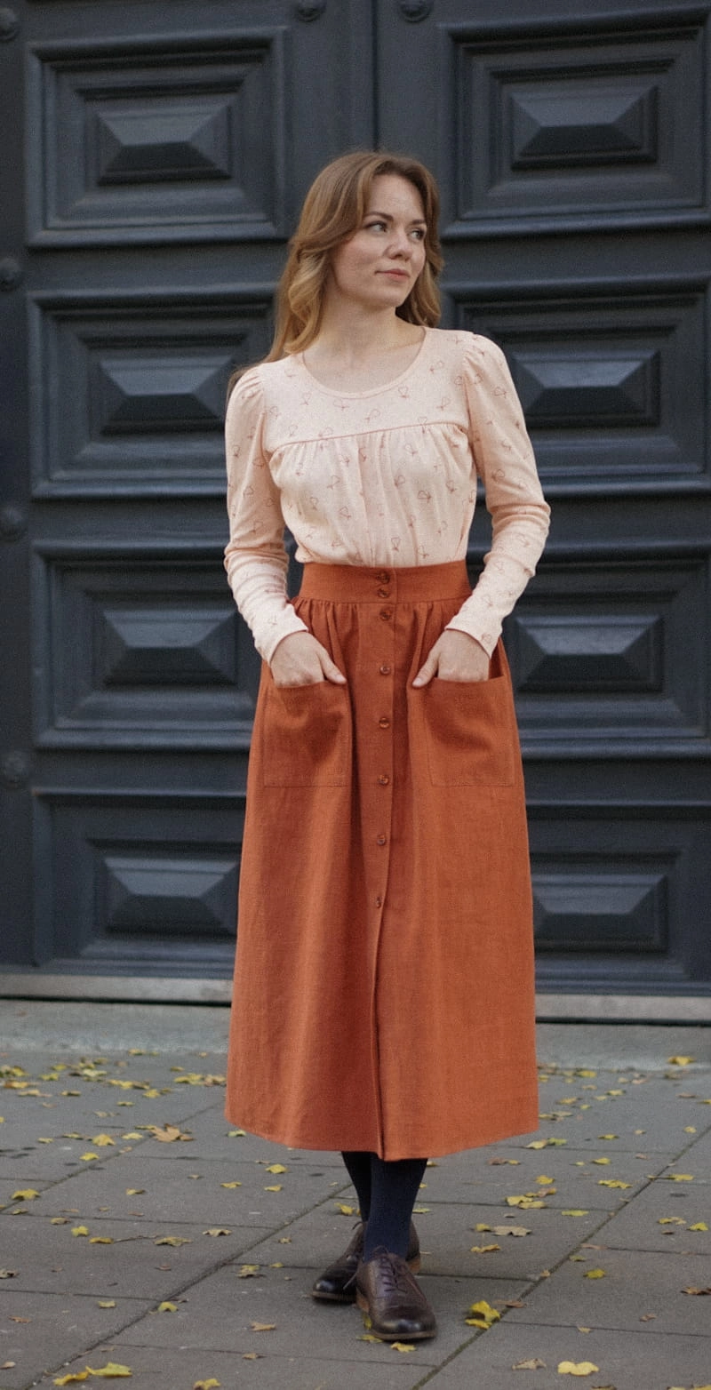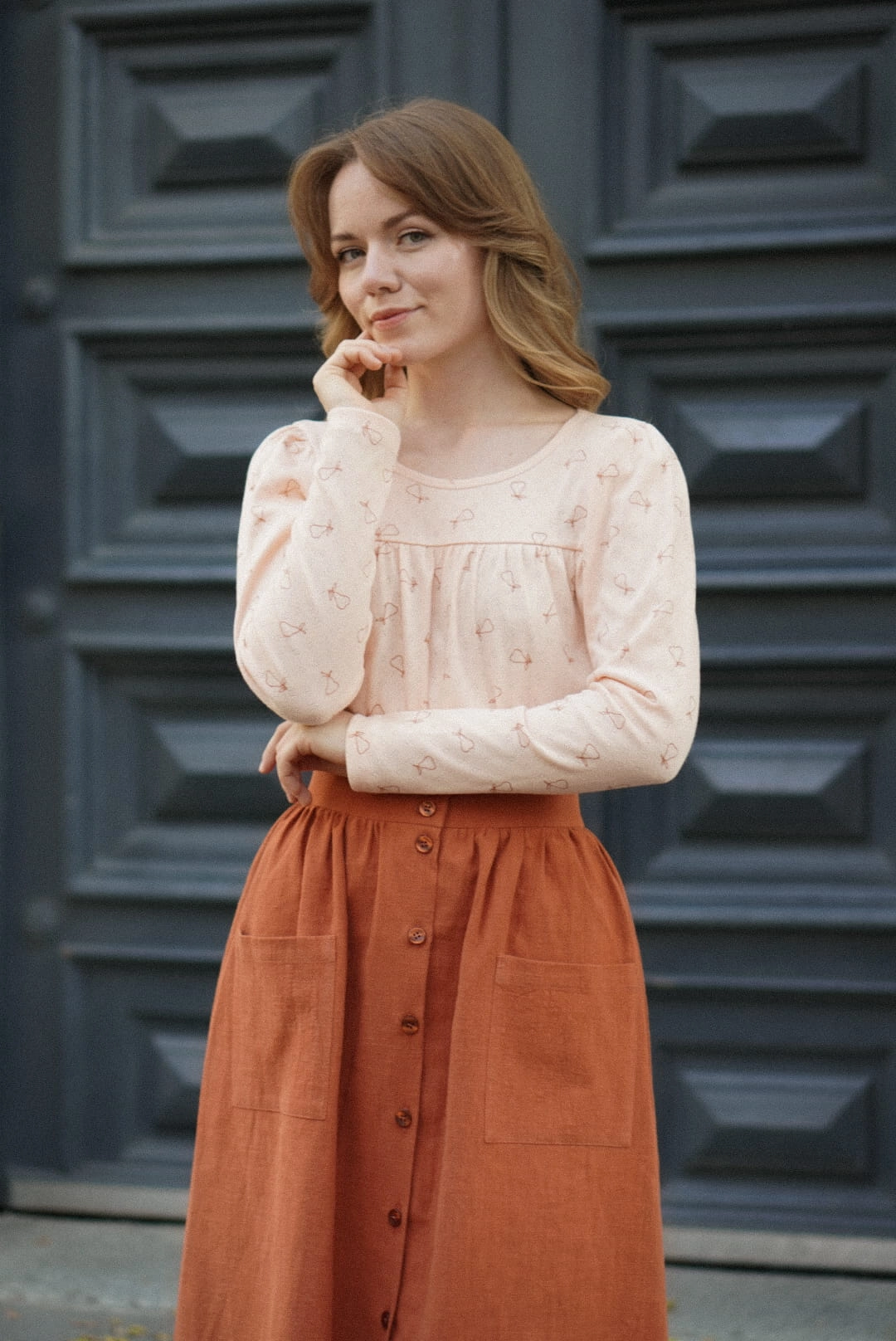 Klasyczna marszczona spódniczka w talii. Posiada boczne kieszenie. Zapinana z tyłu na kryty zamek.