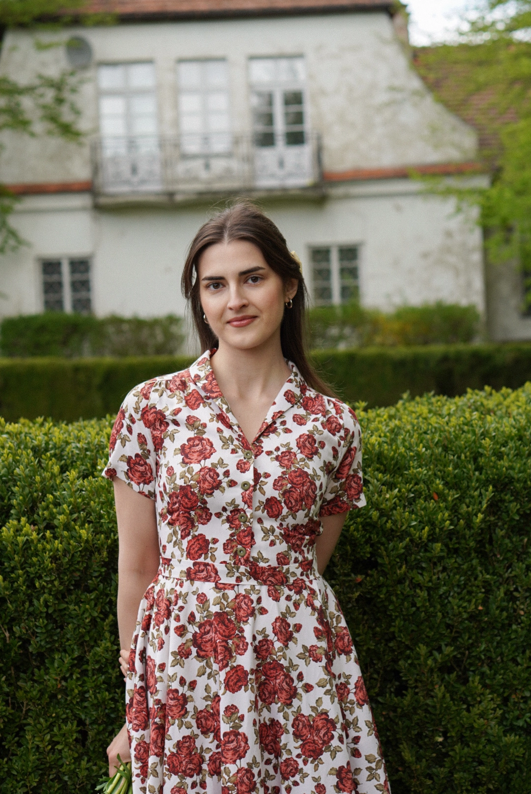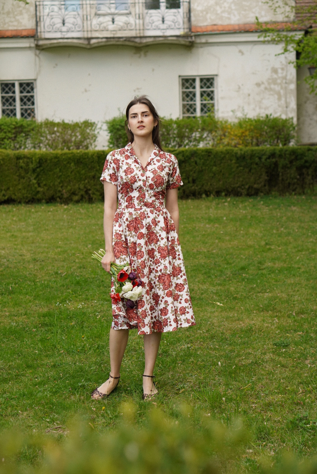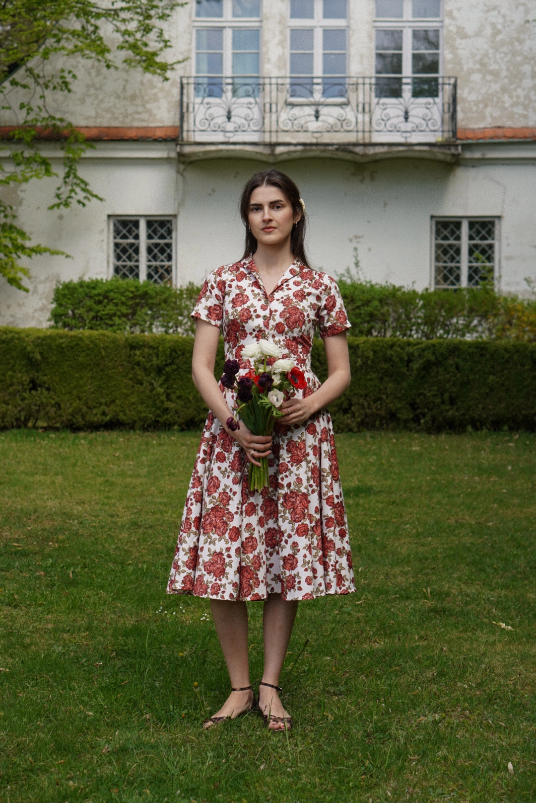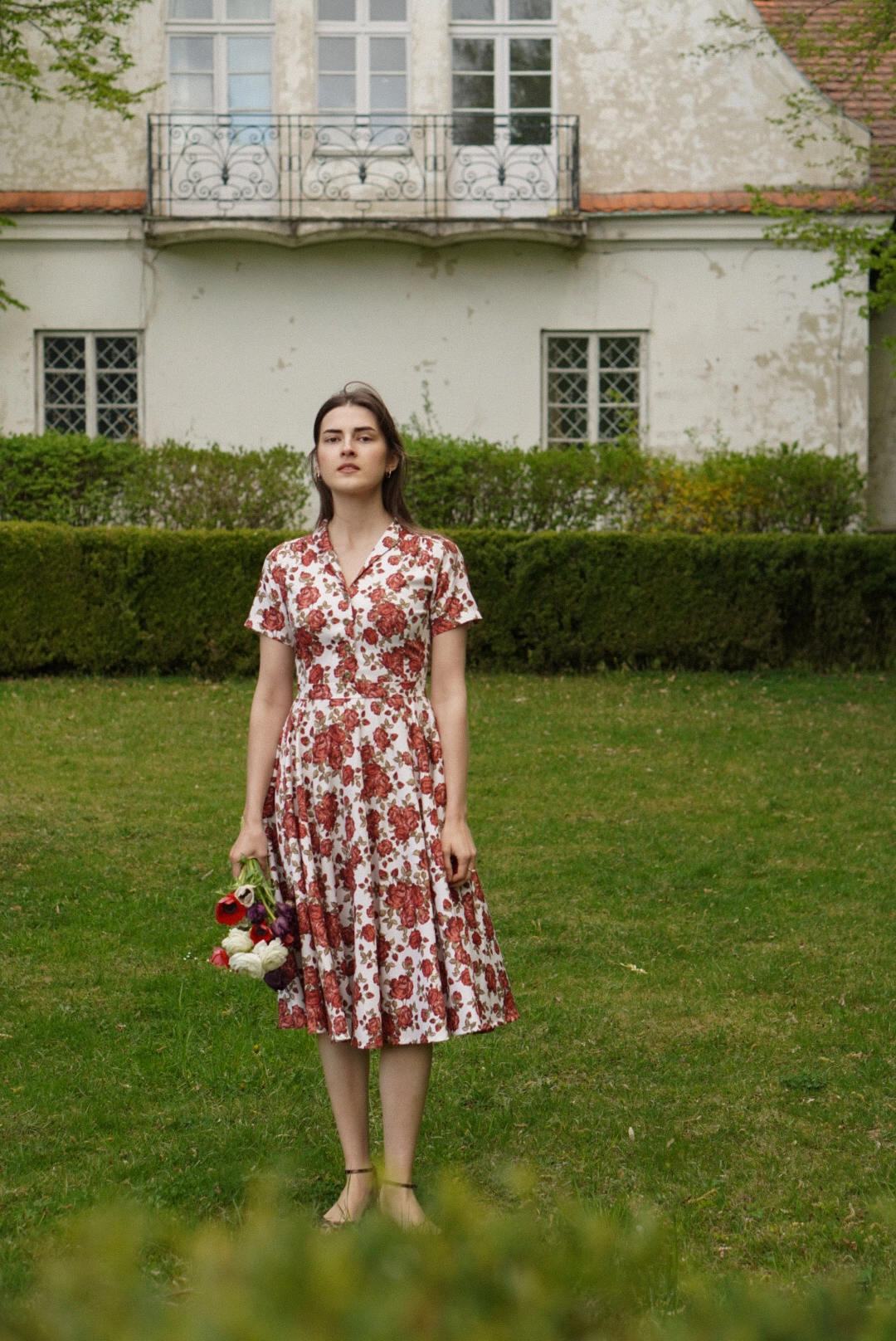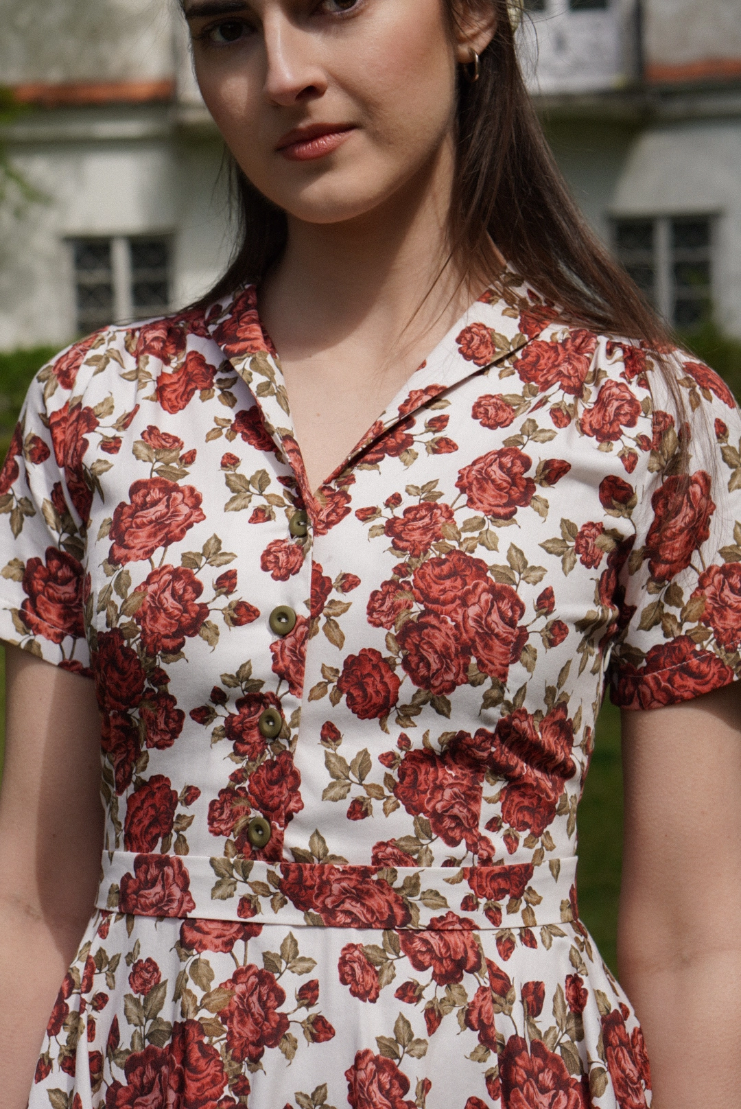 Klasyka, nawiązująca do lat 30. Spódnica z pełnego koła, będzie pasować do wielu kobiecych sylwetek. Szalowy wywijany kołnierz, podkreślający i wysmuklający szyje. Sukienka posiada pasek do związania w talii oraz niewidoczne boczne kieszenie.