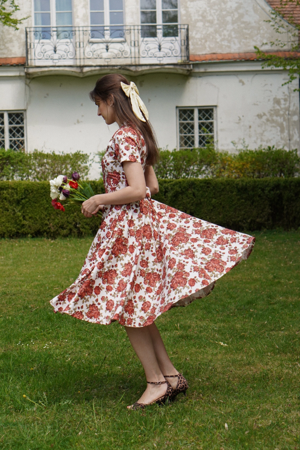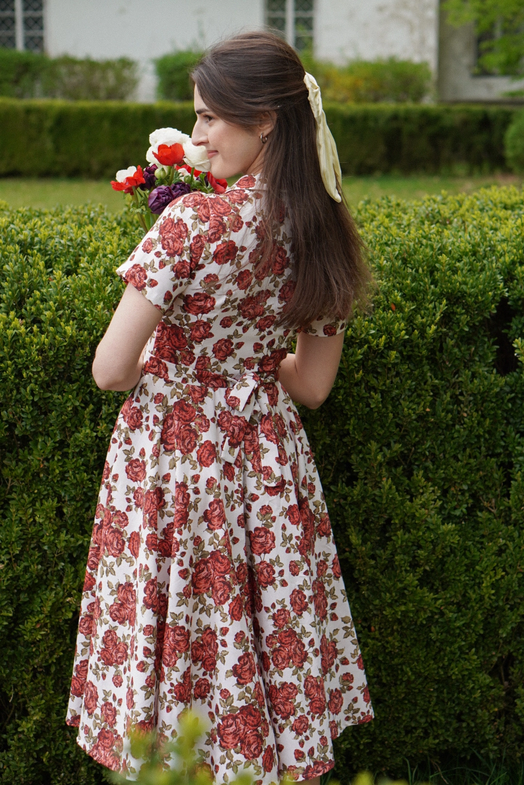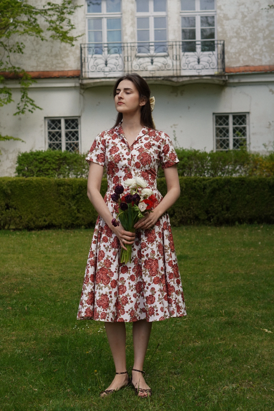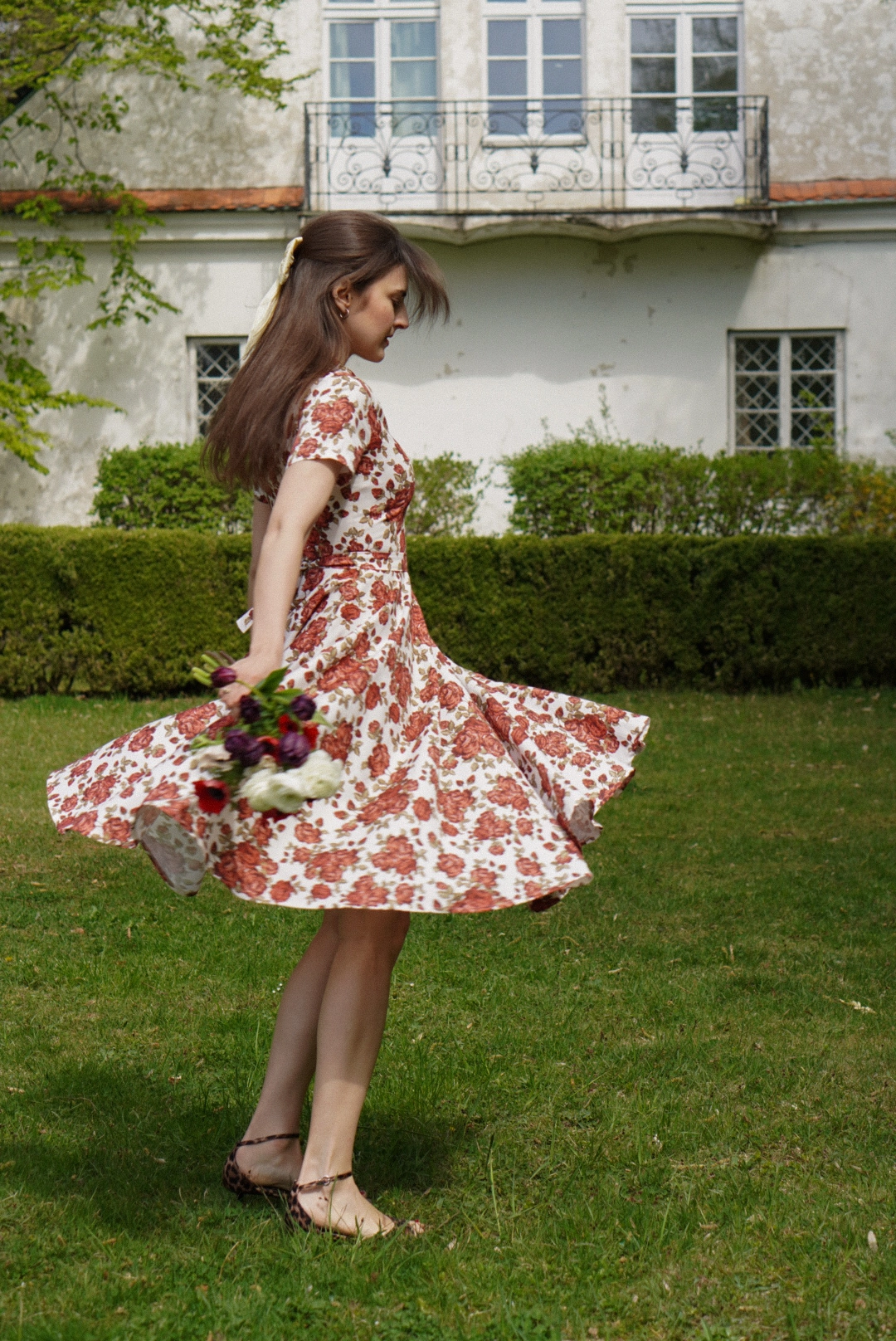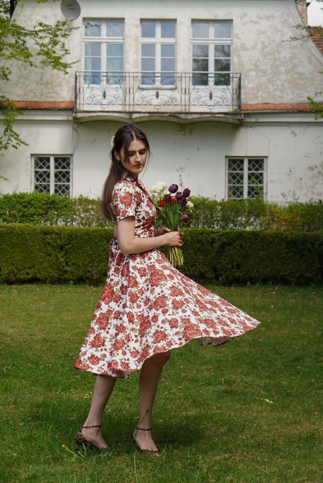 Klasyka, nawiązująca do lat 30. Spódnica z pełnego koła, będzie pasować do wielu kobiecych sylwetek. Szalowy wywijany kołnierz, podkreślający i wysmuklający szyje. Sukienka posiada pasek do związania w talii oraz niewidoczne boczne kieszenie.