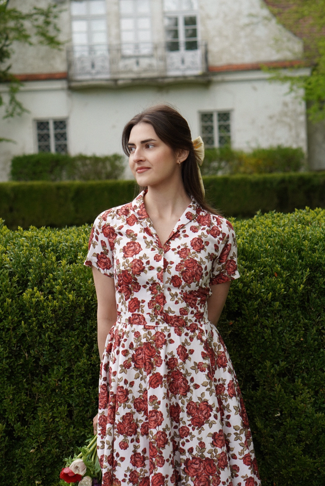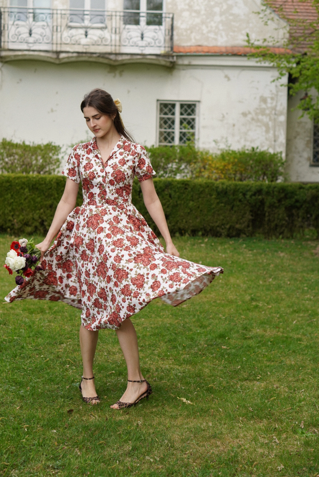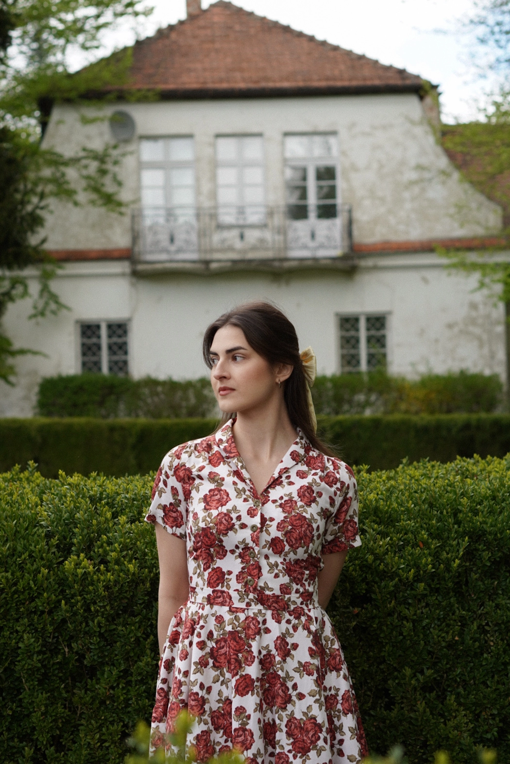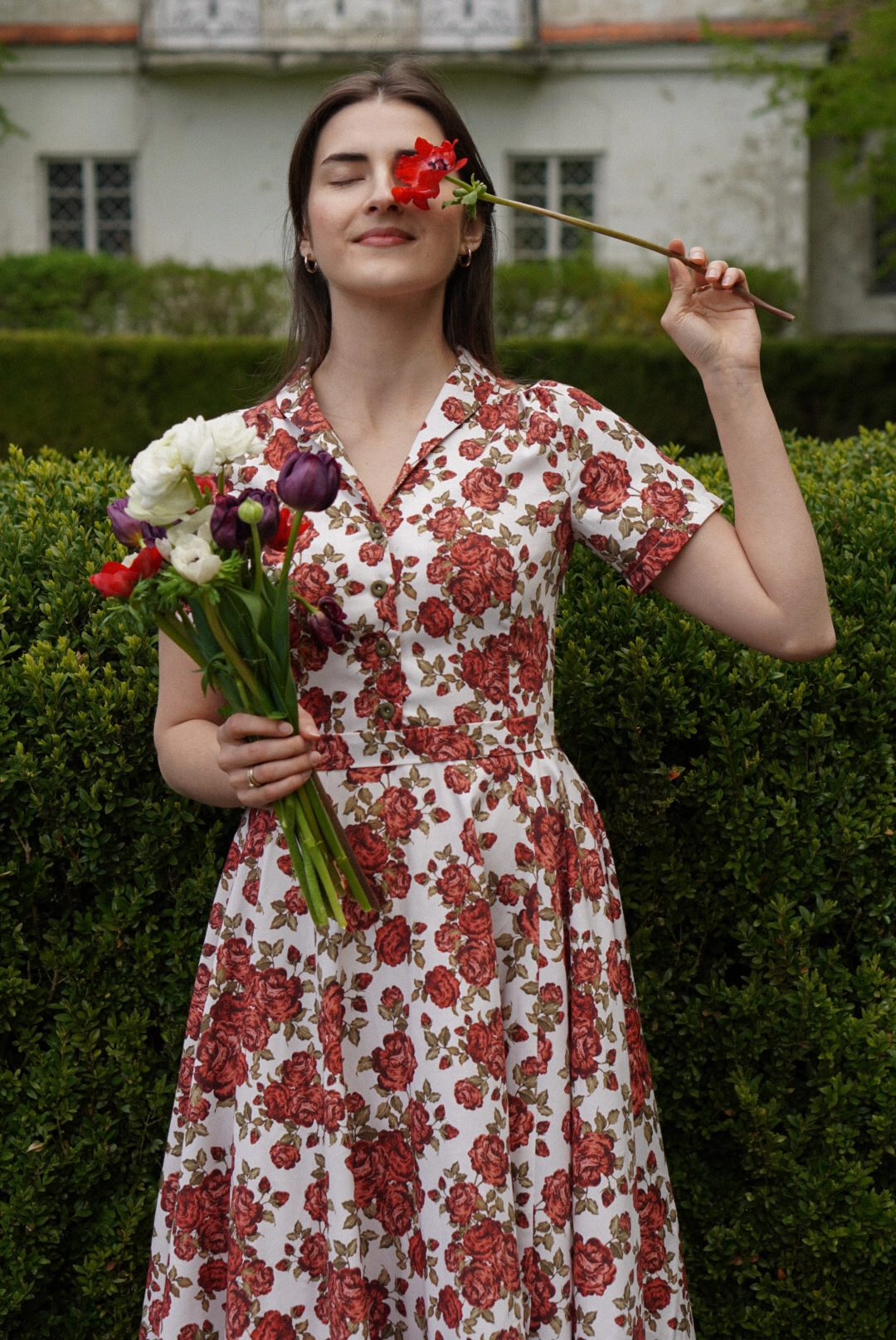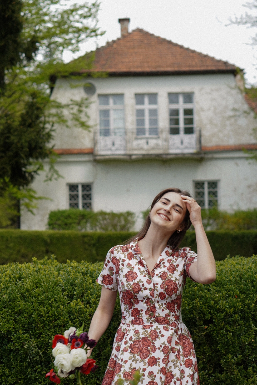 Klasyka, nawiązująca do lat 30. Spódnica z pełnego koła, będzie pasować do wielu kobiecych sylwetek. Szalowy wywijany kołnierz, podkreślający i wysmuklający szyje. Sukienka posiada pasek do związania w talii oraz niewidoczne boczne kieszenie.