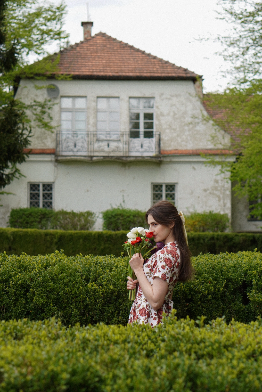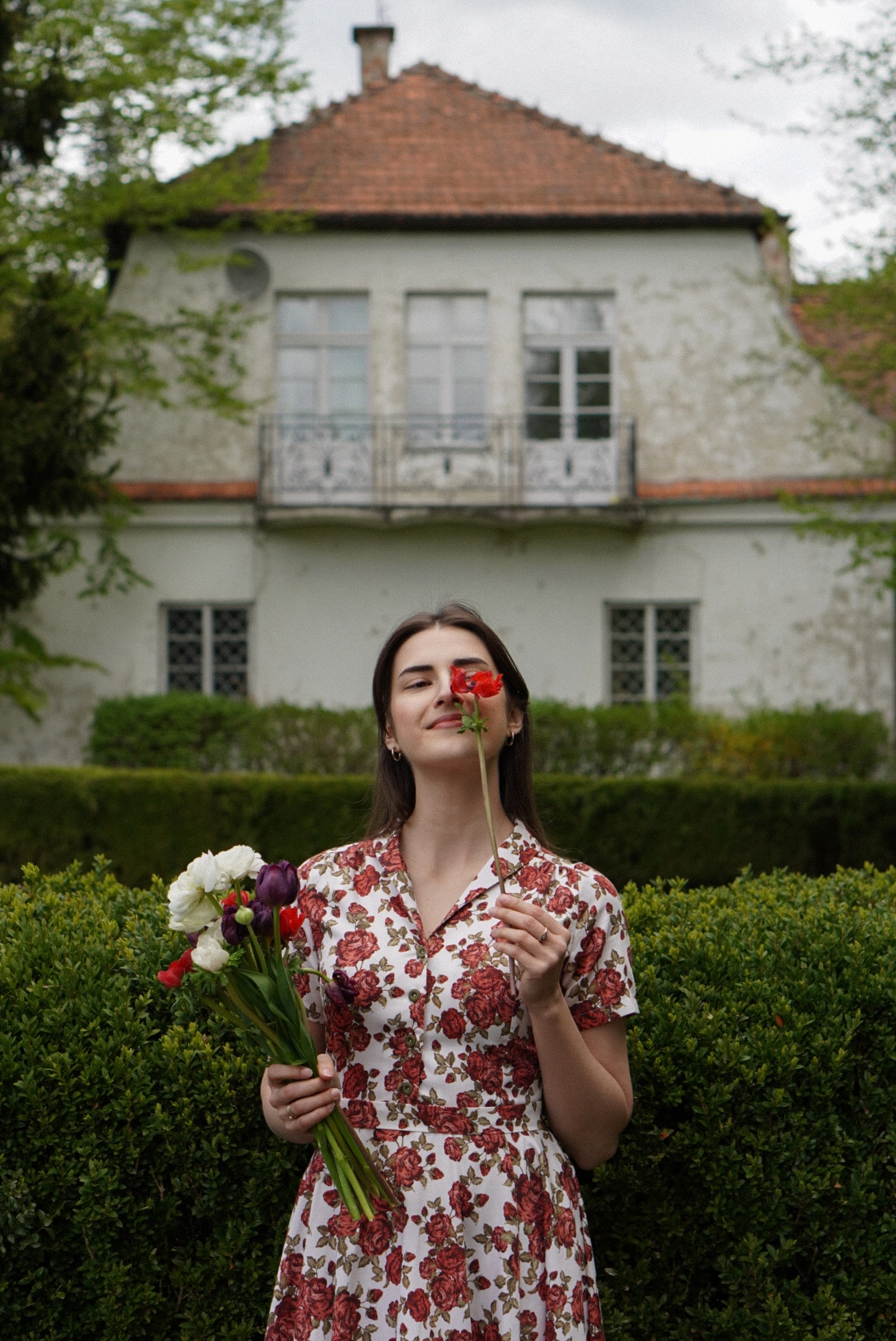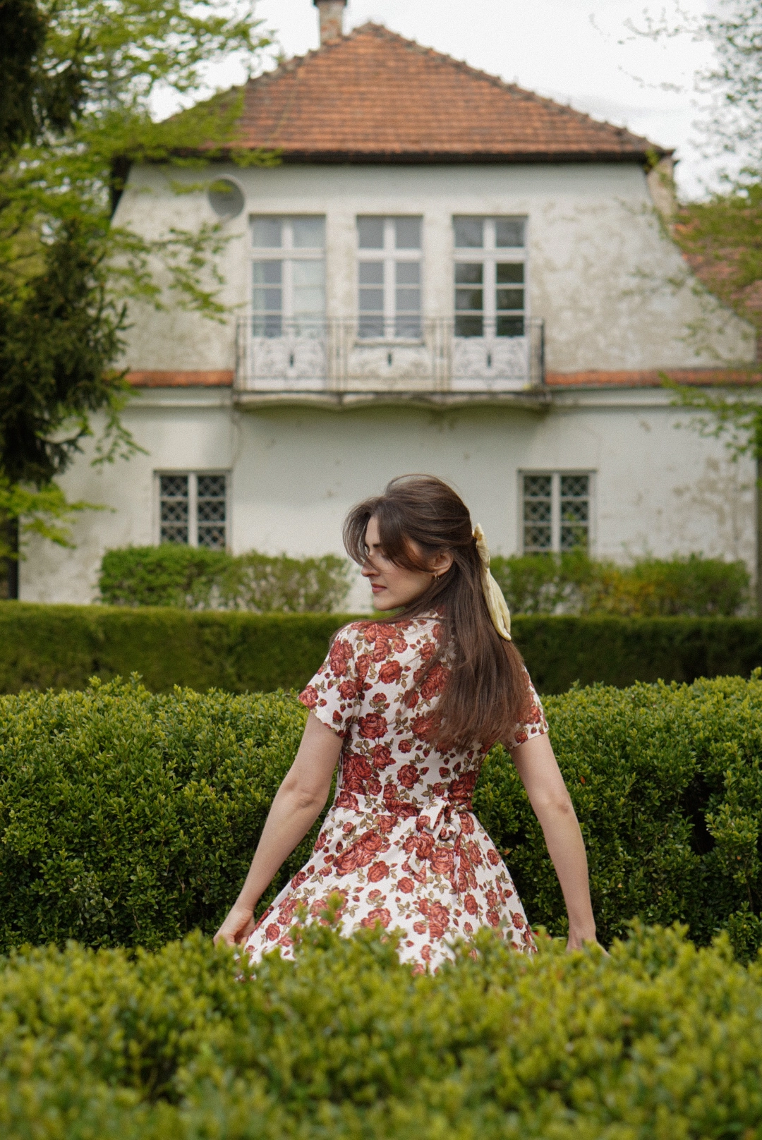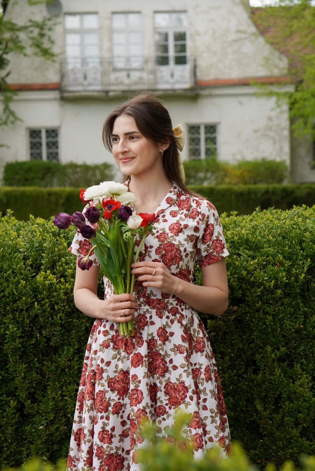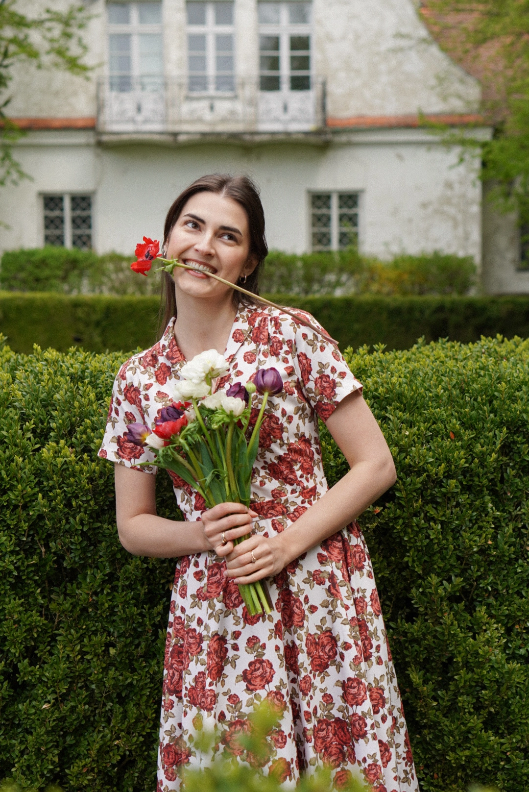 Klasyka, nawiązująca do lat 30. Spódnica z pełnego koła, będzie pasować do wielu kobiecych sylwetek. Szalowy wywijany kołnierz, podkreślający i wysmuklający szyje. Sukienka posiada pasek do związania w talii oraz niewidoczne boczne kieszenie.
