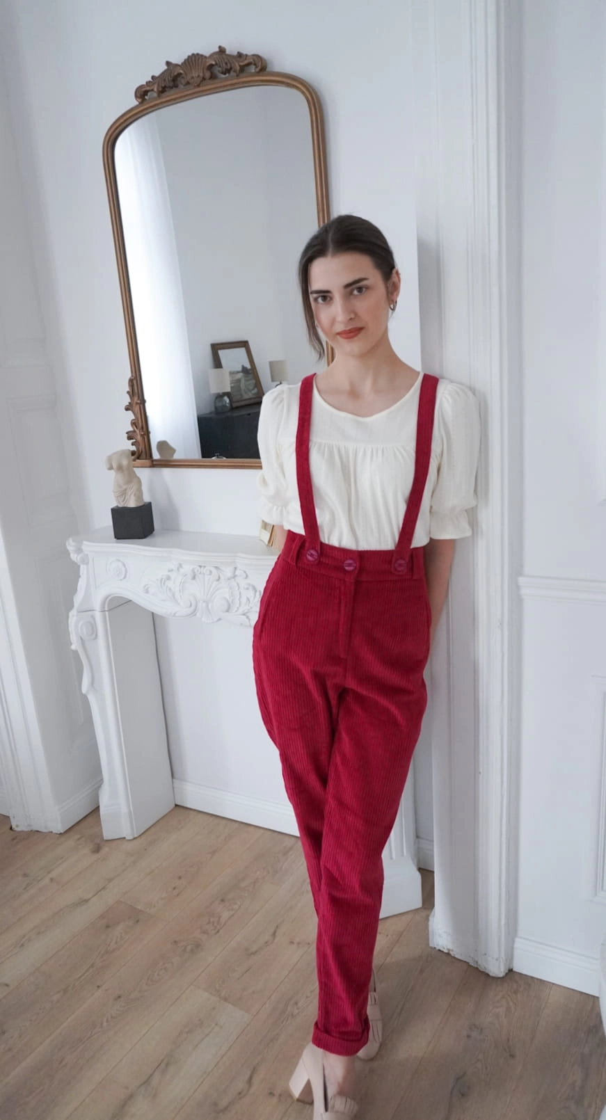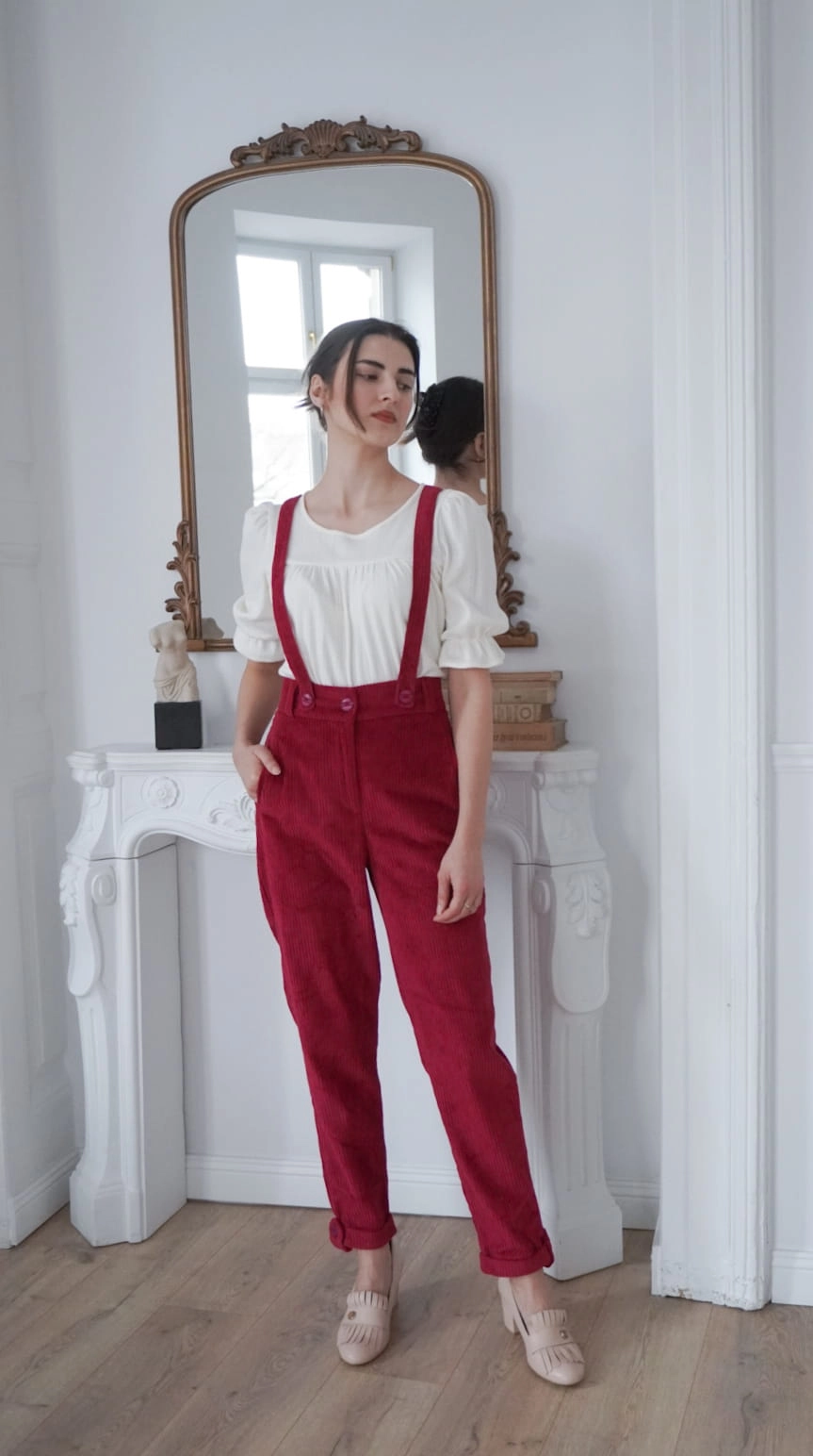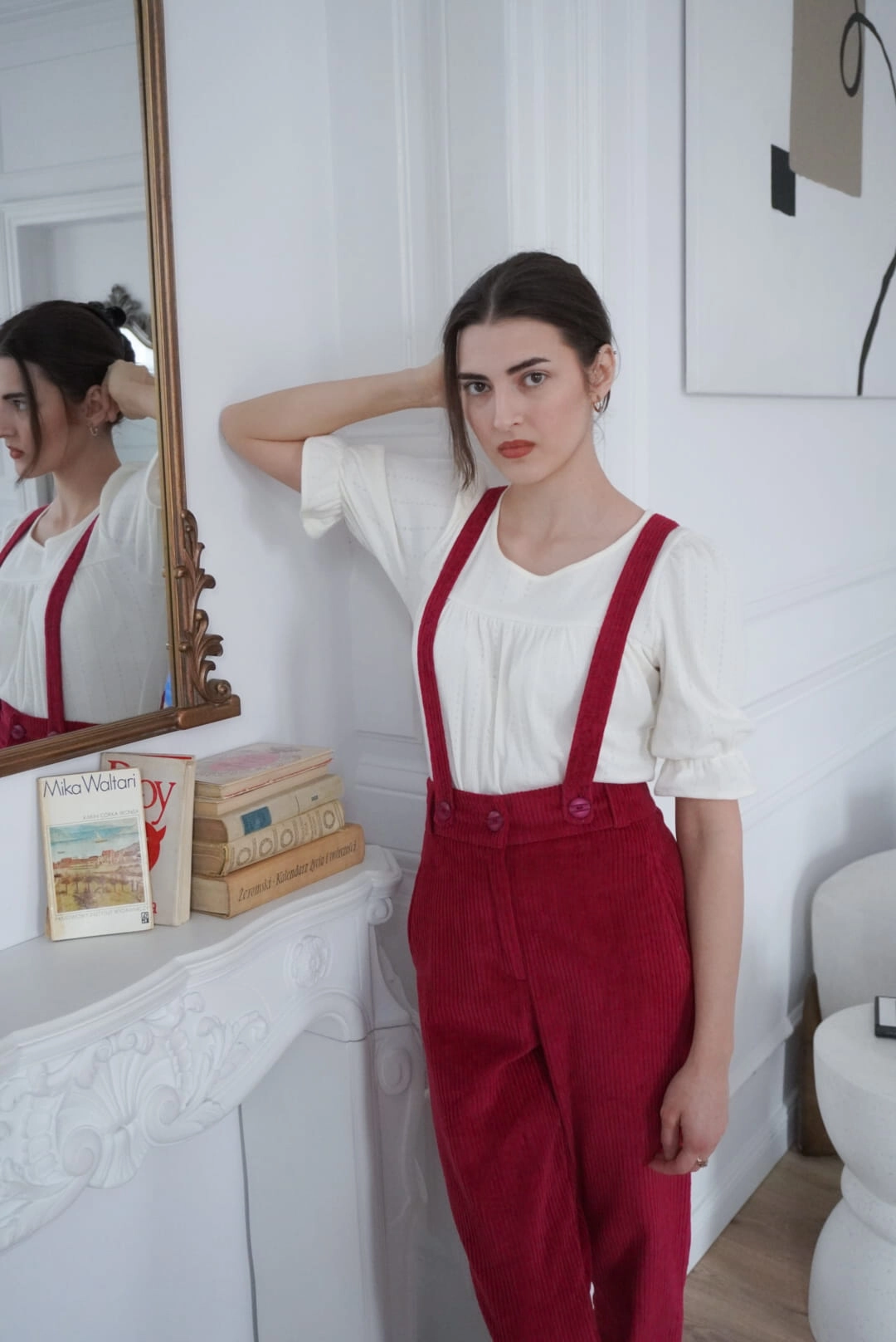 Pełna klasyka, proste, dopasowane, podkreślające sylwetkę. Na pupie naszyte kieszenie, otwarte. Z przodu dwie kieszonki wlotowe. Dopełnieniem spodni są doszyte szelki oraz ozdobne podwinięcie przy nogawkach z guzikiem.