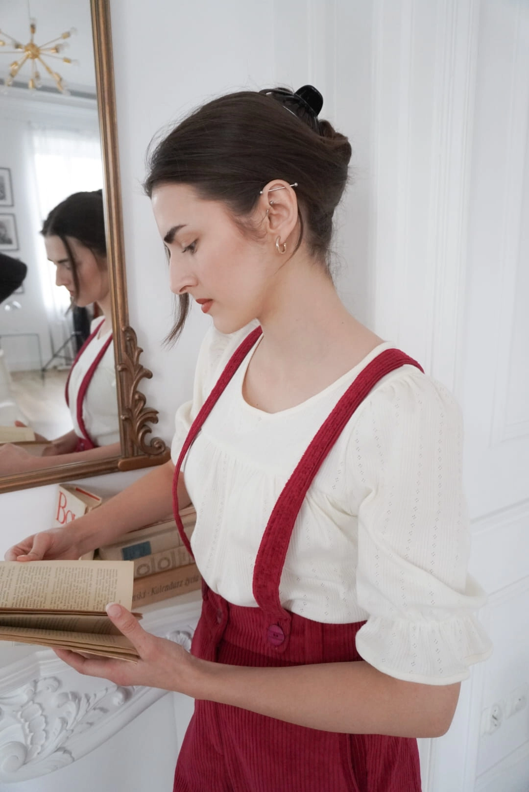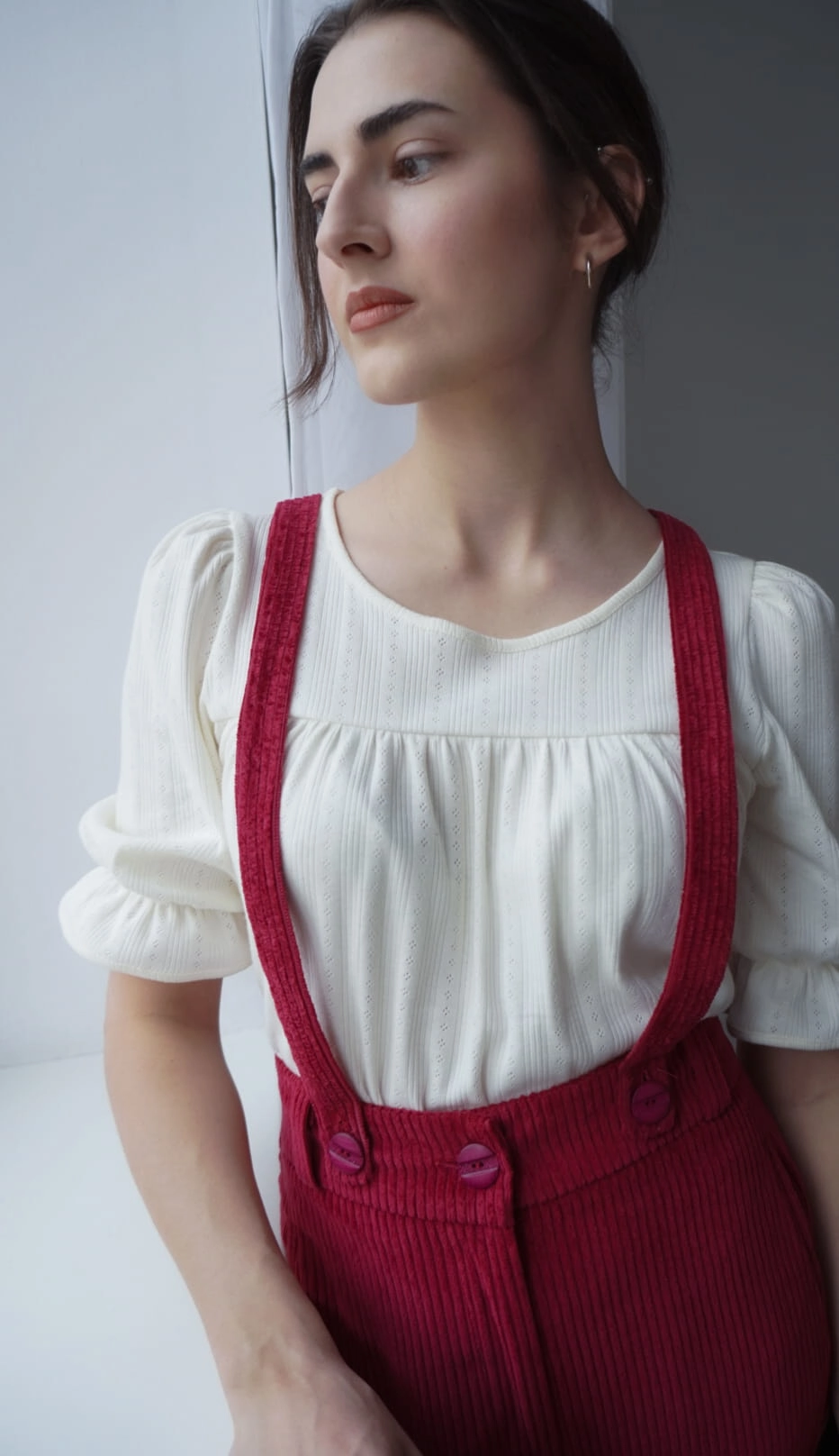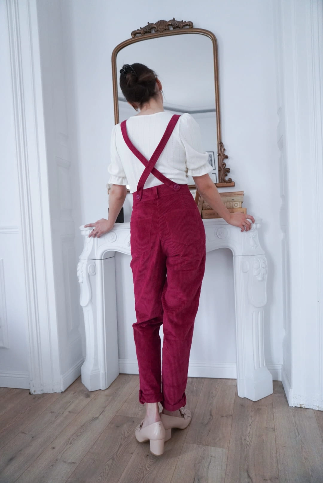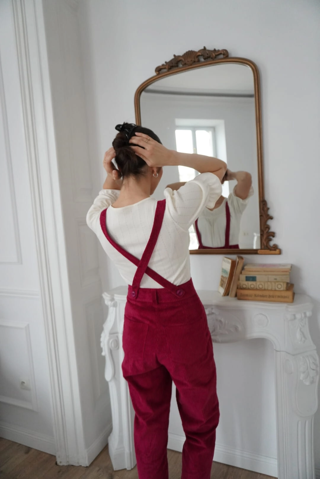 Pełna klasyka, proste, dopasowane, podkreślające sylwetkę. Na pupie naszyte kieszenie, otwarte. Z przodu dwie kieszonki wlotowe. Dopełnieniem spodni są doszyte szelki oraz ozdobne podwinięcie przy nogawkach z guzikiem.