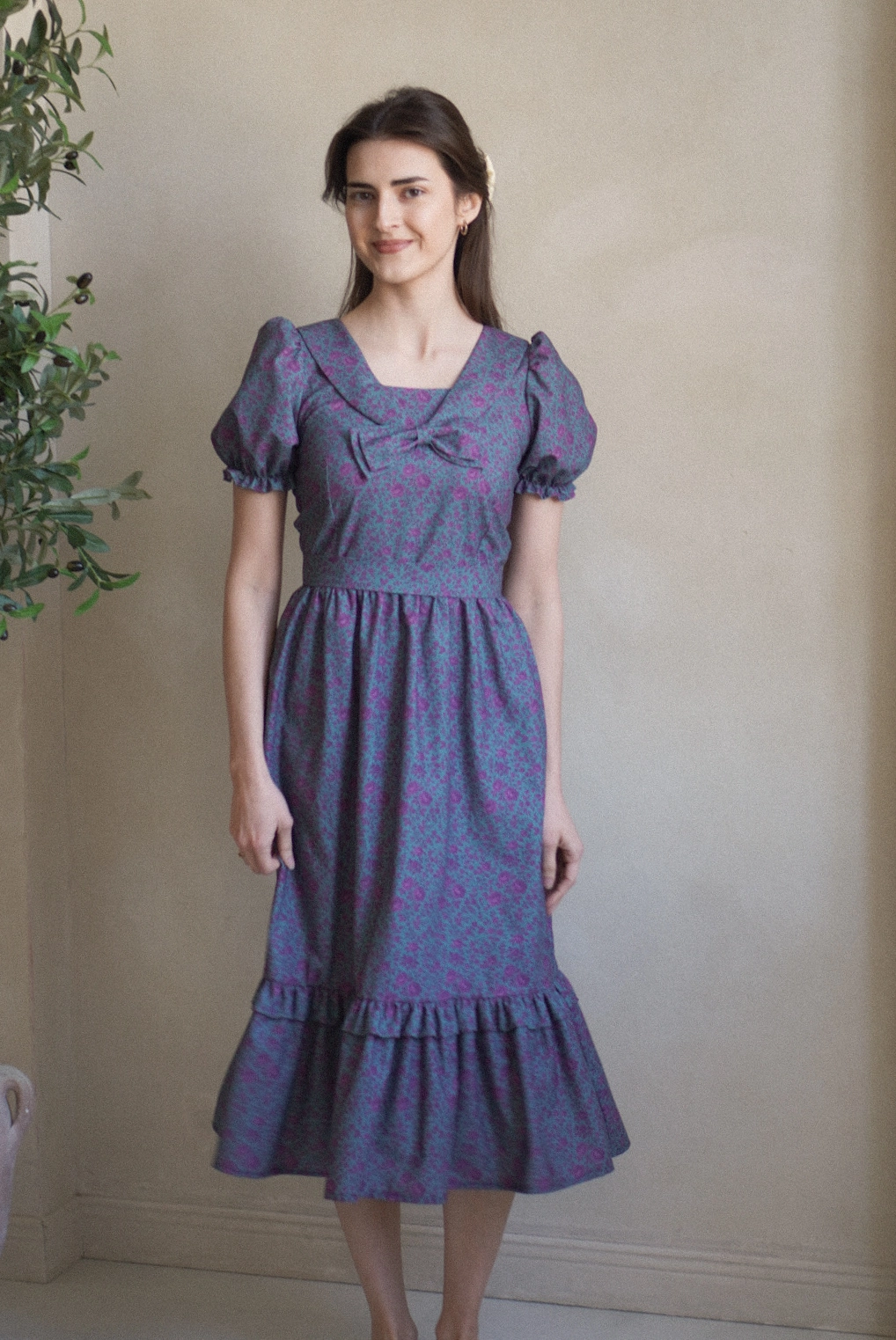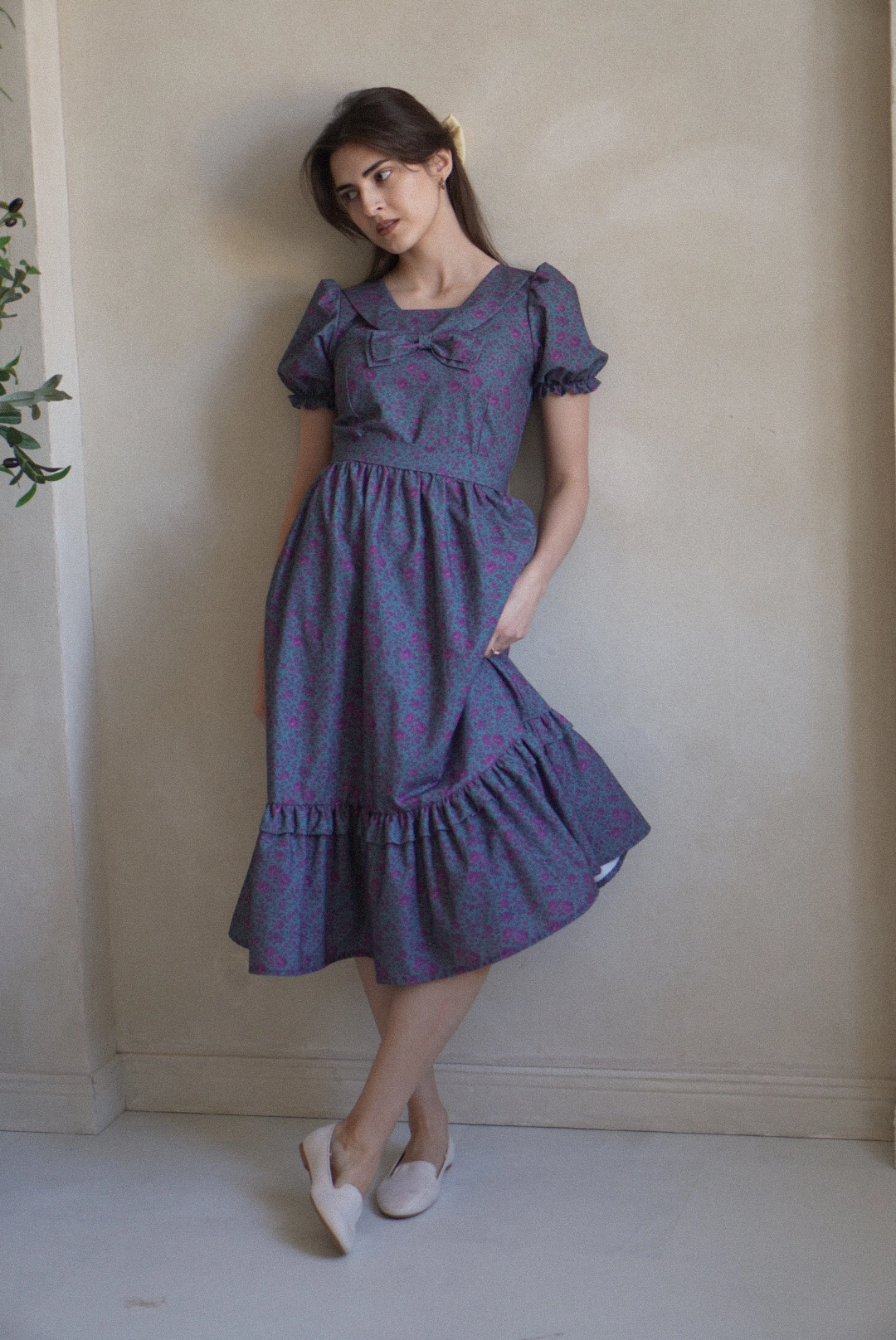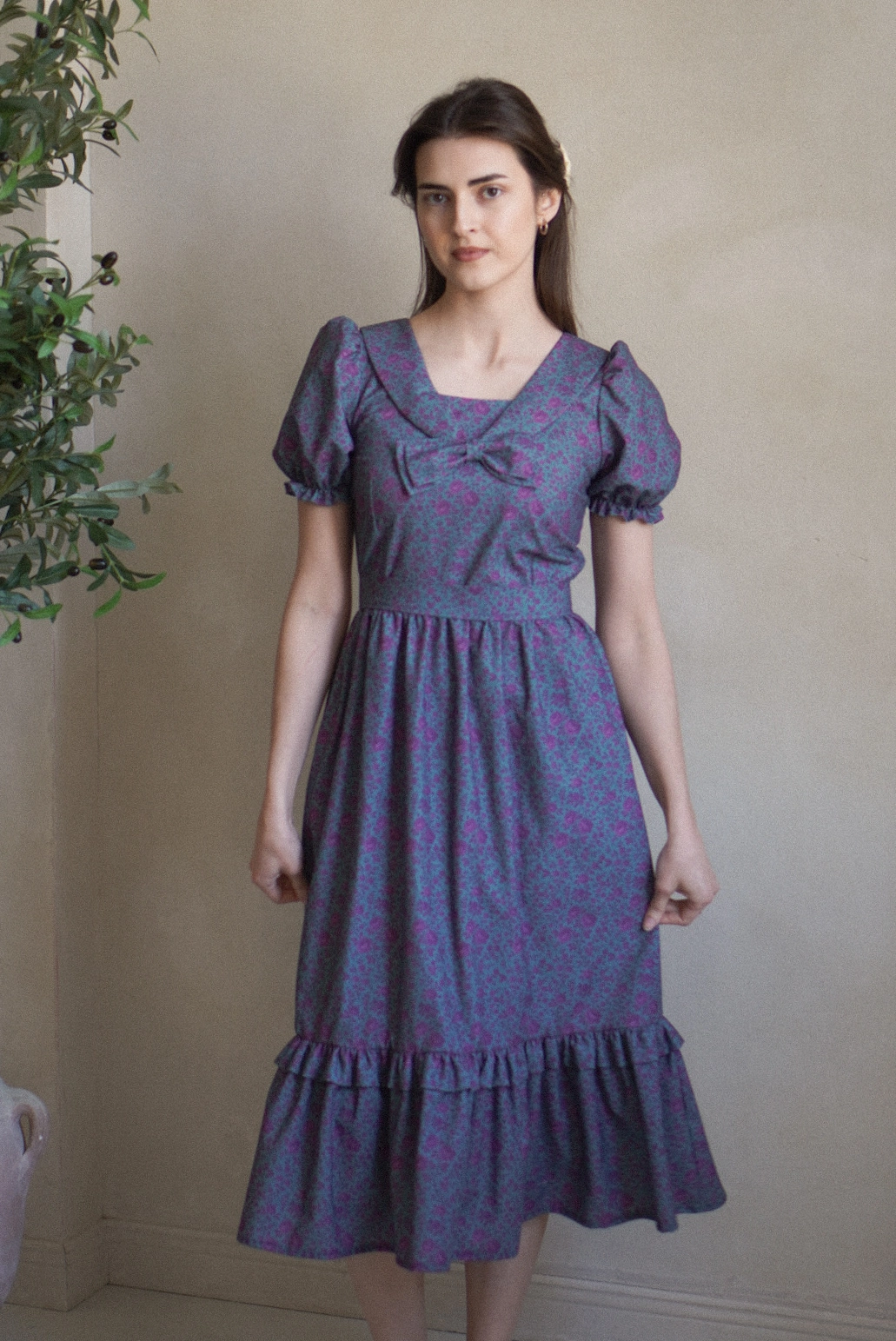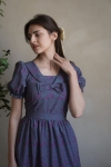 Klasyczna sukienka z prostokątnym dekoltem z kołnierzem z kokardką. Spódnica marszczona w kształcie litery „A” z falbanką na wysokości kolan. Rękawki zakończone gumeczką. Sukienka pasek do związania w talii.